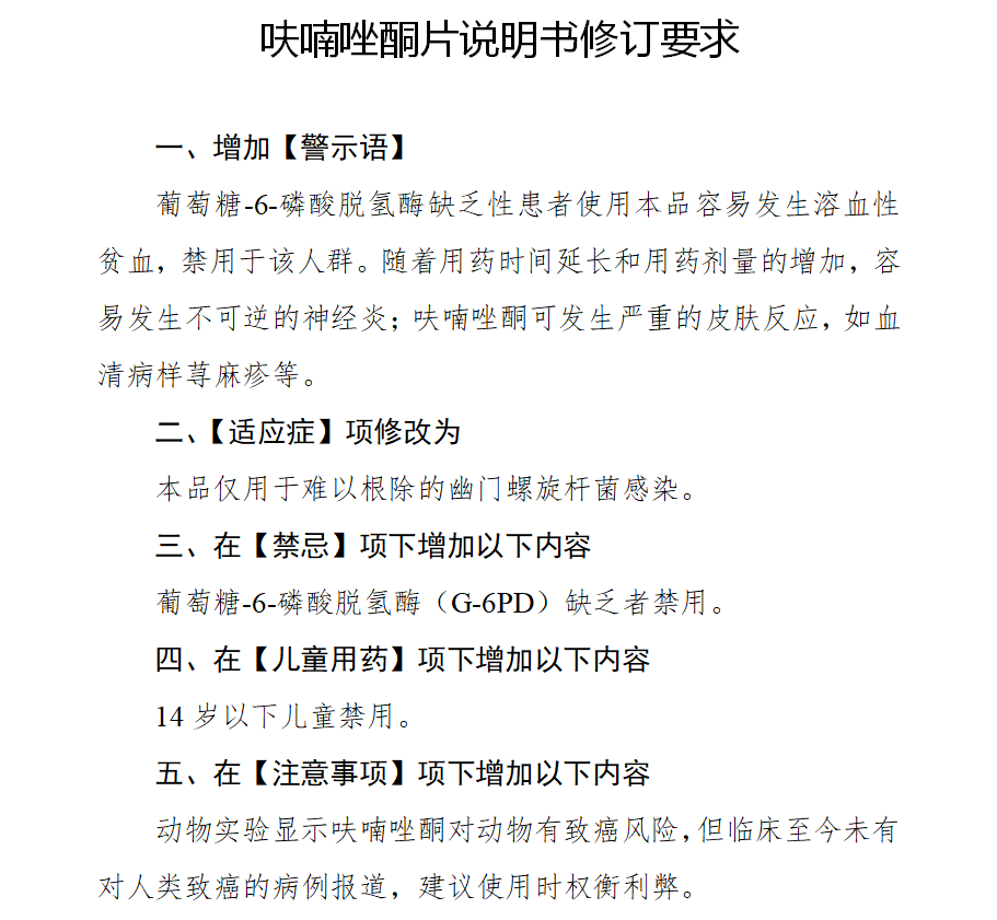 2018年7月,国家药监局曾修订呋喃唑酮片说明书,将本品适应症修订为仅用于难以根除的幽门螺旋杆菌感染,禁忌症增加了葡萄糖-6-磷酸脱氢酶(G-6PD)缺乏者禁用,儿童用药增加了14岁以下儿童禁用。注意事项中指出,动物实验显示呋喃唑酮对动物有致癌风险,但临床至今未有对人类致癌的病例报道,建议使用时权衡利弊。并且增加了警示语,呋喃唑酮随着用药时间延长和用药剂量的增加,容易发生不可逆的神经炎;呋喃唑酮可发生严重的皮肤反应,如血清病样荨麻疹等。